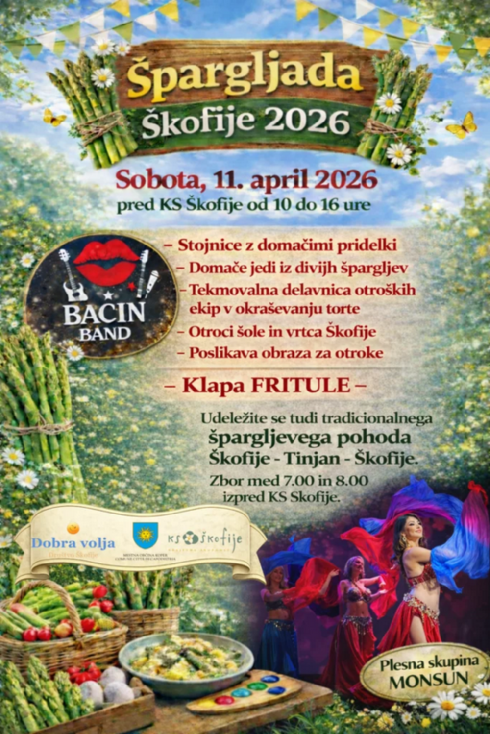Obiskovalci bodo lahko uživali ob stojnicah z domačimi pridelki ter okušali različne domače jedi iz divjih špargljev. Posebno dogajanje bo namenjeno tudi najmlajšim – otroci osnovne šole in vrtca Škofije bodo sodelovali v ustvarjalni delavnici okraševanja tort, na voljo pa bo tudi poslikava obraza.